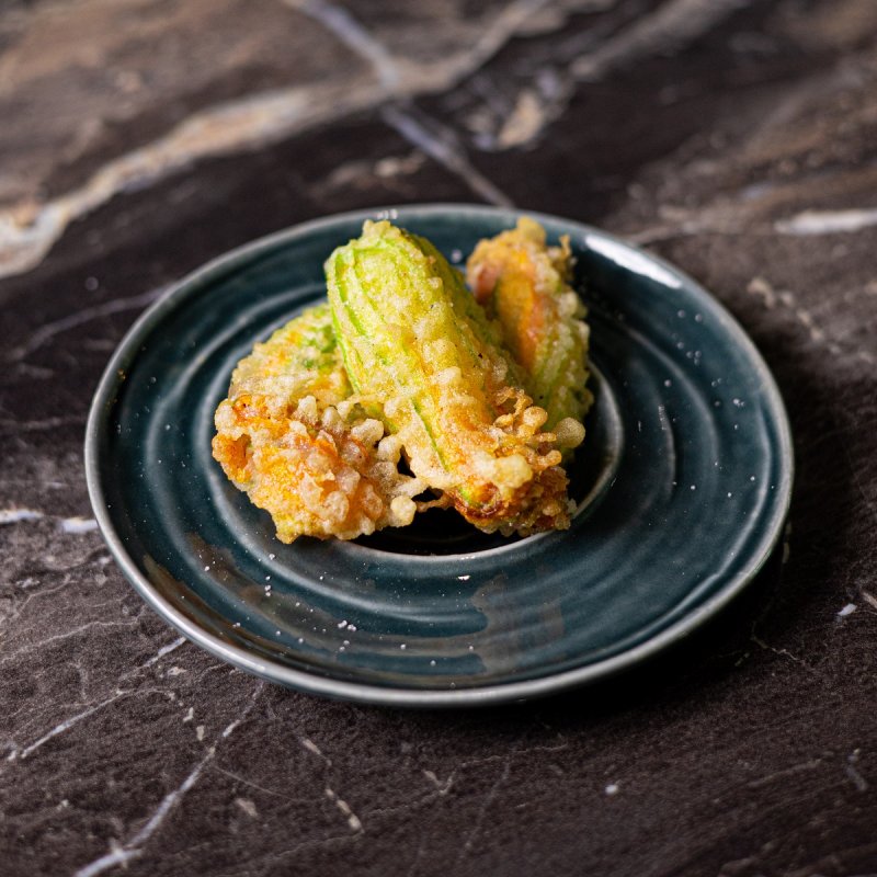 La “Fiori & alici” è una pizza dall’impasto tradizionale con provola, fiori di zucca, datterini gialli, alici di Cetara e zest di limone, accompagnata – per il percorso enologico – sempre dal Caprettone Olivella, e per le birre dalla English Ale dei Monaci Vesuviani.