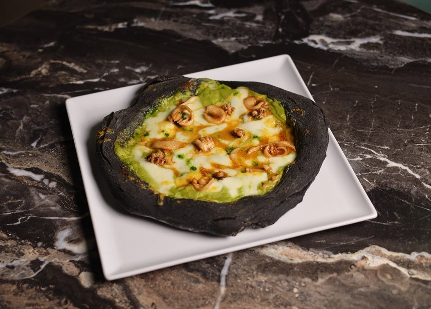 La “Mare Fuori”, ispirata alla celebre serie tv, è una pizza dall’impasto al nero di seppia con crema di piselli, fiordilatte, crema di prezzemolo aromatizzata al limone e seppioline precedentemente saltate in padella con paprika. Per questa pizza l’abbinamento di vini è il Caprettone delle Cantine Olivella, un bianco dai sentori floreali, fruttati e freschi, che esalta piacevolmente il topping di mare e terra. L’abbinamento delle birre è invece una English Ale Monaci Vesuviani.