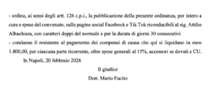 Obbligo di rettifica: Il pizzaiolo è stato condannato a pubblicare il provvedimento giudiziario sui propri canali social (Facebook e TikTok) per 30 giorni consecutivi.