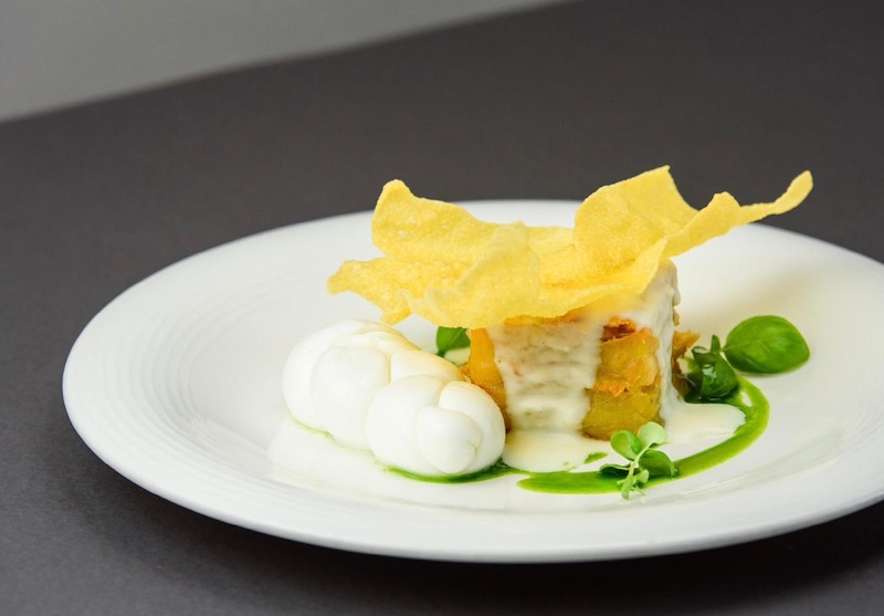 Nata nel 2004 quasi per caso, la Millefoglie di Patate e provola in salsa di mozzarella con chips di riso è il piatto più rappresentativo dello chef campano. “E’ un piatto molto strutturato, ma lo servo come antipasto. Mi accompagna ormai da tanti anni ed è un omaggio ad una cara amica che ora non c’è più. E’ anche una delle mie più grandi soddisfazioni nei menù che ho costruito nel tempo. E’ un piatto che riscuote sempre grande successo”, continua lo chef.