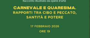 Arte, cibo e letteratura per la prima volta in un unico filone creativo. ARTEINDIRETTA in collaborazione con IAV CLUB presenta martedì 17 febbraio alle ore 19,00 un racconto illustrato da opere d’arte, a cura di Fabiana Mendia e letture di Mario Autore. L’ARTE PRESAPERLAGOLA – Carnevale e Quaresima. Rapporti tra cibo e peccato, santità e potere coniuga infatti i rapporti, gli scambi e le suggestioni tra le diverse discipline, elementi che saranno illustrati dalla curatrice in approfondimenti piacevoli e stimolanti, per coinvolgere un pubblico di studiosi, appassionati e anche solo curiosi con contrattazioni parallele e dinamiche di storia dell’arte, storia della società e della vita materiale, ed ancora, storia dell’evoluzione del gusto, storia dell’arte culinaria e storie dei cuochi e delle loro invenzioni.