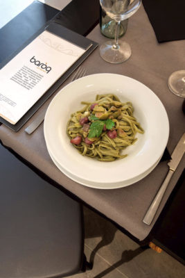 I fasti del passato vengono riportati in auge nel Baroq Art Bistrot, grazie alla cucina d’autore dello chef Antonio Tubelli. “Effettua un lavoro di ricerca e recupero degli ingredienti storicamente legati al territorio campano – spiega il titolare Roberto Gargano – materie prime come la torzella, un’antica varietà di cavolo a foglia larga, e il peperone crusco dell’Irpinia”. Tra i piatti che rispolverano gli antichi ricettari di cucina partenopea, il celebre Scammaro. Il piatto è un’eredità della sapienza gastronomica di Ippolito Cavalcanti, uno dei massimi esponenti della cucina tradizionale partenopea. Consistente in pasta bollita e poi fritta e condita, questo capostipite dei primi piatti napoletani era consumato durante i giorni di Quaresima. Tra gli ingredienti non è infatti previsto nessun ingrediente di carne, ma il suo gusto ingannava il divieto di mangiare ricco.