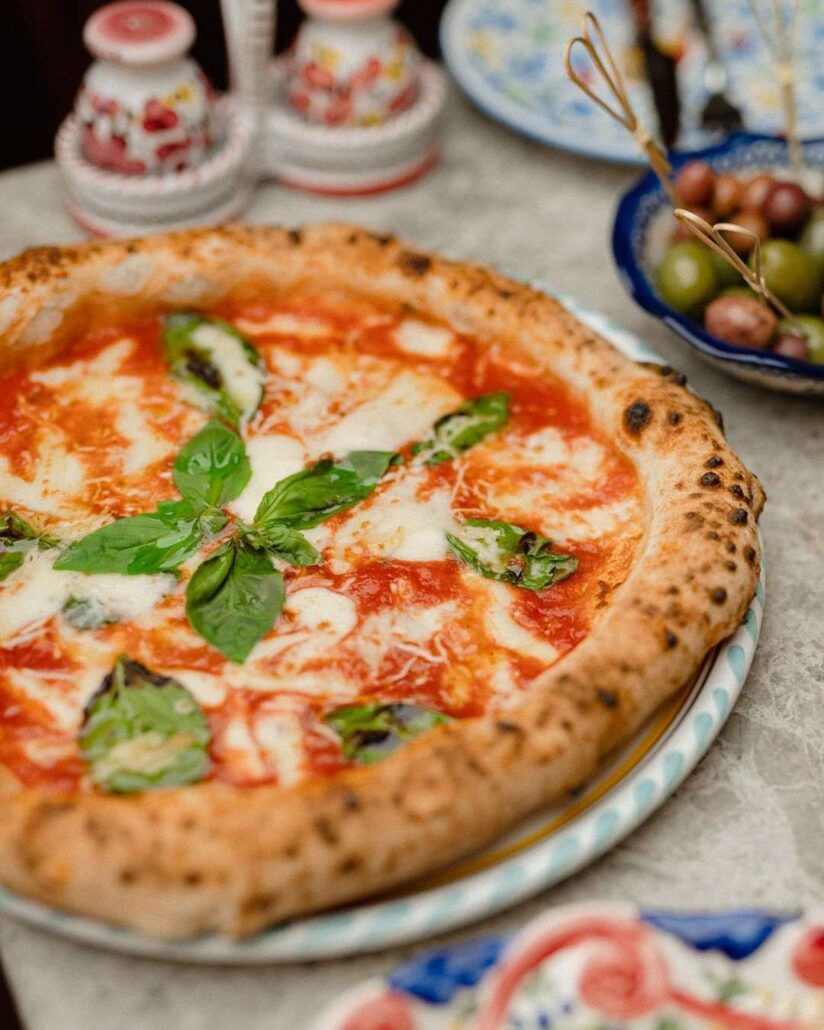 Nel menù troviamo per esempio la Napoletana, rappresentante indiscussa del capoluogo campano e regina delle pizze, con Prosciutto di Parma DOP, rucola, Parmigiano Reggiano DOP, pinoli e aceto balsamico, ma anche la classica Margherita, con salsa di pomodoro San Marzano DOP, fiordilatte, basilico e olio d’oliva.