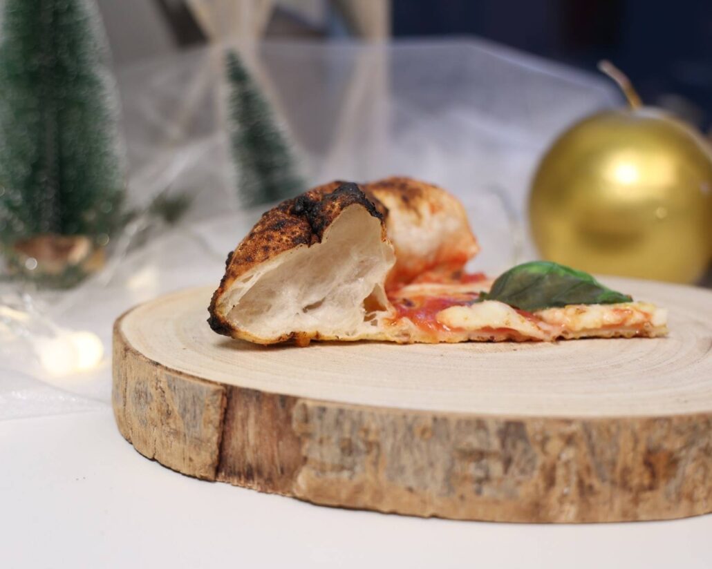 Le pizze realizzate da Stefano seguono la filosofia contemporanea. Per l’impasto viene utilizzato un blend composto da farina 0 al 90%, e da farina tipo 1, al 10%. La magia inizia effettuando un prefermento alla base, per garantire una maggiore friabilità e bontà al prodotto finale. La lievitazione dei panetti, che può durare dalle 24 alle 48 ore, termina con il rinfresco, al fine di ottenere una pizza dagli standard ottimali, anche grazie al suo alto livello di idratazione, pari al 70 – 75%.