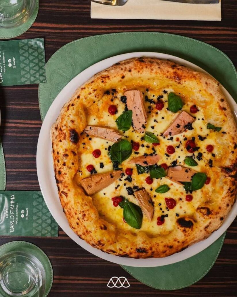 Per quanto concerne i topping Carlo Fiamma Pizza e Cantina, oltre ad offrire i classici gusti della tradizione, propone anche delle varianti originali, frutto della creatività di Carlo, presenti nel menù sotto la voce “La Mia Identità”. Ogni pizza presente nella lista racconta dei sapori dei paesi che costellano la Costiera, prima fra tutti Amalfi, preparata con Fiordilatte dei Monti Lattari, crema di pomodori verdi, girello di pesce spada, pesto di rucola, zest di Sfusato Amalfitano e olio Evo DOP.