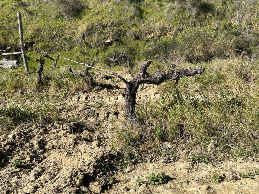 E’ questo il motivo per cui Andrea e Claudia, due giovani ingegneri di Catania, hanno deciso di acquistare qui un antico palmento del XVIII sec. con 10 ettari di vigneti a circa 400 metri slm sui Monti Erei. Si tratta dei più antichi vigneti di Caltagirone, prima tra tutte la cosiddetta “vigna ammischiata”, probabilmente una delle ultime in circolazione. In questo fazzoletto di terra le viti di Nero d’Avola e Frappato crescono insieme e, condizione unica, maturano contemporaneamente. In altri luoghi invece i due vitigni arrivano a maturazione a distanza di 15 giorni. A distinguere le piante solo un fiocchetto colorato, rosso per il Nero d’Avola, bianco per il Frappato. Ogni vite è una scultura vivente e il solo passeggiarci accanto emoziona e incanta.