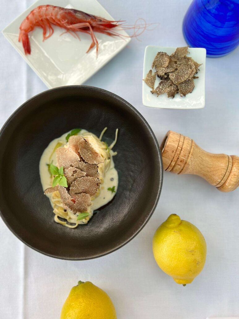 Quest’ultimi servono per uno dei piatti più richiesti: i tagliolini cacio e pepe con tartufo e gamberi.