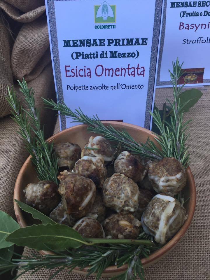 Come antipasto (gustum) sono stati serviti “scriblita”(focaccia con spezie) “caseus” (ricotta) “caseus caprinus” (formaggio di capra), “brassica pompeiana“ (cavolo pompeiano in salsa di garum) e “cucurbitas frictas” (zucca fritta). La portata principale (mensae primae) è stata a base di “porcellum assus“ (maialino arrostito), “esicia omentata” (polpette avvolte nell’omento, ovvero la rete di maiale) e “patina de apua fricta” (torta di acciughe fritte) mentre come dolce e frutta (mensa secondae) sono stati serviti “mala” (mele annurche), “mala granata”(melograni), “pira” (pere), “uvae” (uva), “caricae” (fichi secchi) del Cilento e “basynias” (struffoli) come dolce, ma anche noci, nocciole e mandorle campane. Il tutto innaffiato da vino (“vinum”) “falernum rubrum” (falerno del massico rosso) e “vinum passim” (vino passito) e “panis Pompeii”.