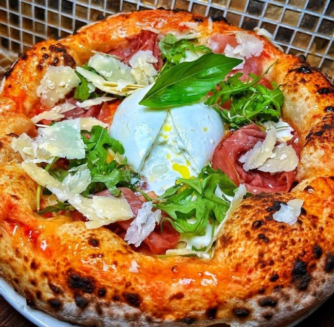 Topping della tradizione con ingredienti direttamente importati dalla nostra terra: pomodoro San Marzano DOP, fiordilatte dal Caseificio Giffoniello, prosciutto crudo di Parma DOP, Gorgonzola DOP.