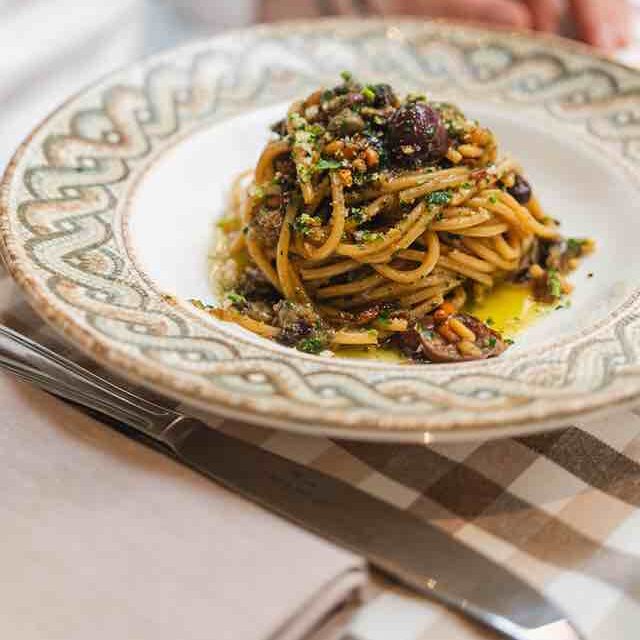 Per l’estate Brigida propone gli spaghetti alla Gravunaro, un piatto nato negli anni ’40, preparato con acciughe, olive, capperi e mollica di pane.