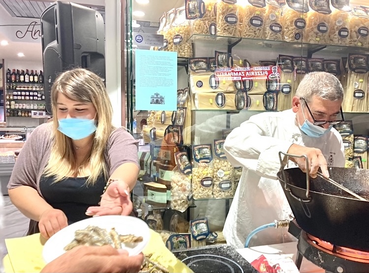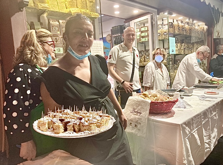 La serata ha avuto il suo riuscitissimo clou nella caratteristica piazzetta, dove sono state servite varie degustazioni, offerte dai titolari delle Botteghe del Gusto d’Eccellenza di Santa Maria in Portico: squisiti piatti, che vengono preparati tradizionalmente in questa ricorrenza e altre tipicità. Dopo l’immancabile aperitivo con sfizioserie regionali, irresistibili candele spezzate con Genovese, frittura di triglie e di alici freschissime, mozzarella di bufala campana, contorni assortiti, stuzzicanti panini, pizze classiche e speciali, ottima frutta di stagione, deliziose graffette e, in chiusura, le golosità, in un buffet di dolci caratteristici, a partire dalla Pastiera. Un trionfo di sapori! Il tutto accompagnato da vini di qualità dalla Campania.