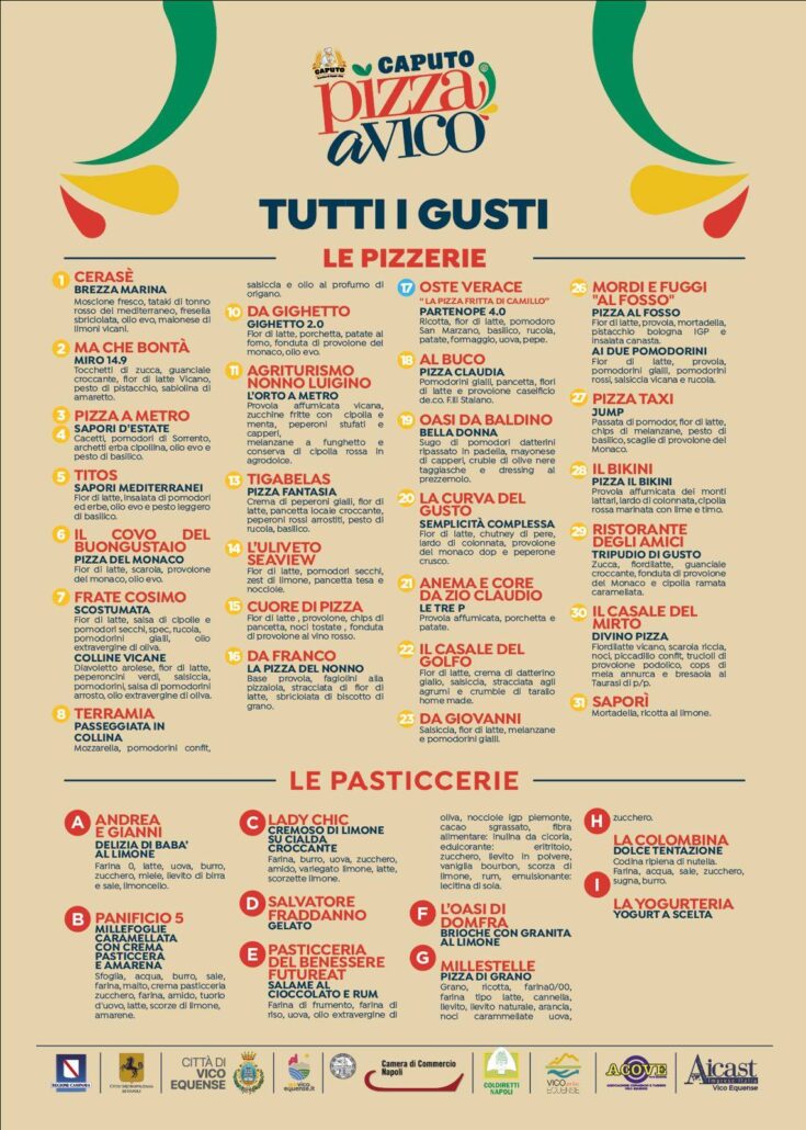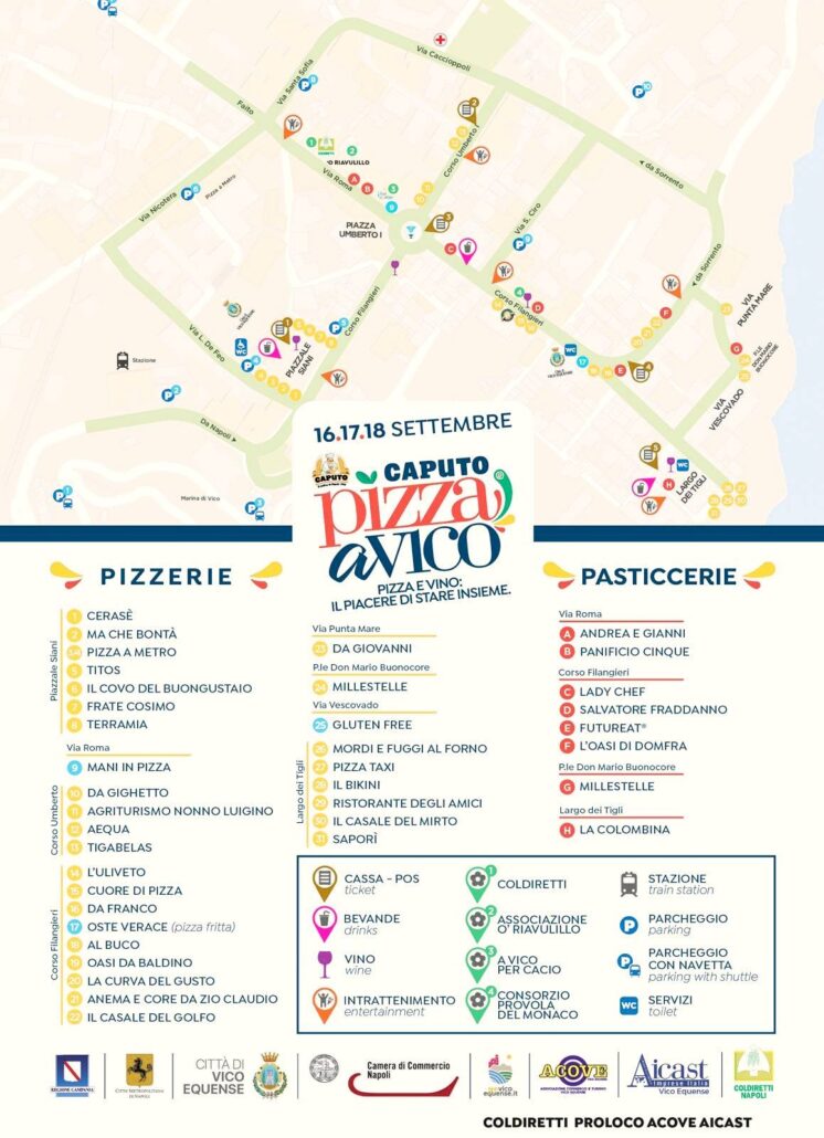Promossa dall’Associazione Pizza a Vico, con il patrocinio di Regione Campania, Città Metropolitana, Camera di Commercio di Napoli, Coldiretti Napoli, Pro Loco Vico Equense, Acove – Associazione commercianti di Vico Equense e della locale sezione dell’Aicast – Associazione Industria, Commercio, Artigianato, Servizi e Turismo, l’iniziativa si avvale del contributo del Comune di Vico Equense, e di