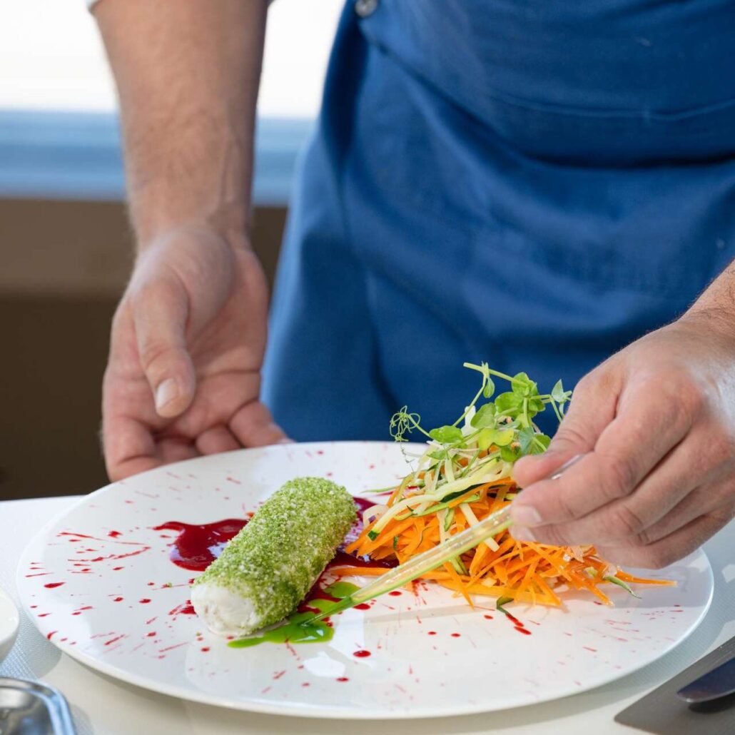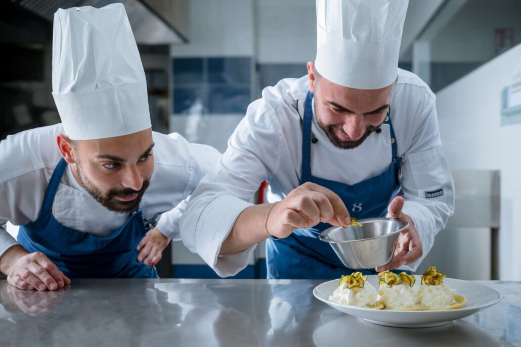 La parte croccante è data poi dalle chips di zucchine, cosparse come petali sui ravioli, in un gioco di contrasti tipico dell’Alta Cucina.