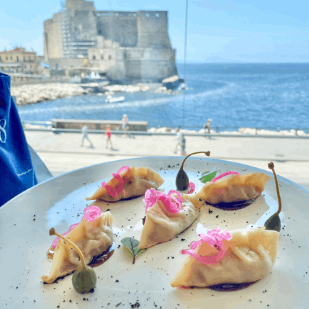 I ravioli, realizzati con pasta fresca fatta a mano, vengono farciti coi sapori del celebre primo piatto della Penisola Sorrentina, per poi fondersi con una spuma fredda realizzata con il Provolone del Monaco DOP.