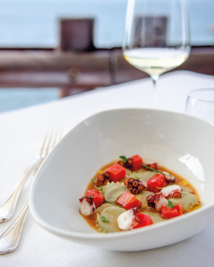 Nella cucina de il Bikini, il protagonista è un menù della tradizione, composto da piatti di mare presentati “in chiave simpatica e sempre raffinata”. Una proposta culinaria semplice, legata alla stagionalità degli ingredienti e realizzata con prodotti tipici, mostra tutta la qualità di piatti classici rivisitati con maestria. Tra gli antipasti serviti a cena, compare quello a base di cozze, riso e patate. L’influenza della tradizione pugliese è evidente, così come il richiamo ad un piatto unico nel suo genere. Una zuppa di cozze alla napoletana conferisce la giusta sapidità, con tutto il meglio del mare; le foglie di basilico fresco e la maggiorana condiscono con gli aromi tipici della macchia mediterranea. Il riso è soffiato per un incredibile effetto crunch; la spuma di patate rappresenta invece la parte cremosa di questa prima proposta. I ravioli, fatti a mano con farina di semola e acqua, custodiscono un ripieno davvero sorprendente: la mollica di pane viene mantecata con un battuto di olive, quelle nere di Gaeta e le verdi di Nocellara. La pasta fresca, “lucidata con un filo di olio evo” subito dopo la cottura, viene condita con un guazzetto di polpo alla luciana, leggero e saporito, e i pomodori pelati San Marzano DOP. “La densità di questo primo piatto e l’intensità del suo sapore sono inimitabili”. A il Bikini, “il giudizio finale arriva dopo l’assaggio”. “Il piatto deve essere bello e presentato bene” – dice lo chef Coppola, che aggiunge – “Il segreto sta nella tecnica, che crea l’effetto visivo”. L’ospitalità e l’accoglienza della famiglia Scarselli incontrano e si fondono con un concetto di ristorazione che ruota attorno all’ospite, con le sue emozioni e i suoi ricordi. “Il punto di vista dei nostri clienti è fondamentale” – afferma Giulio Coppola e continua – “La cucina de il Bikini è soggettiva e può essere liberamente interpretata, senza pressioni nè altri disorientamenti”.