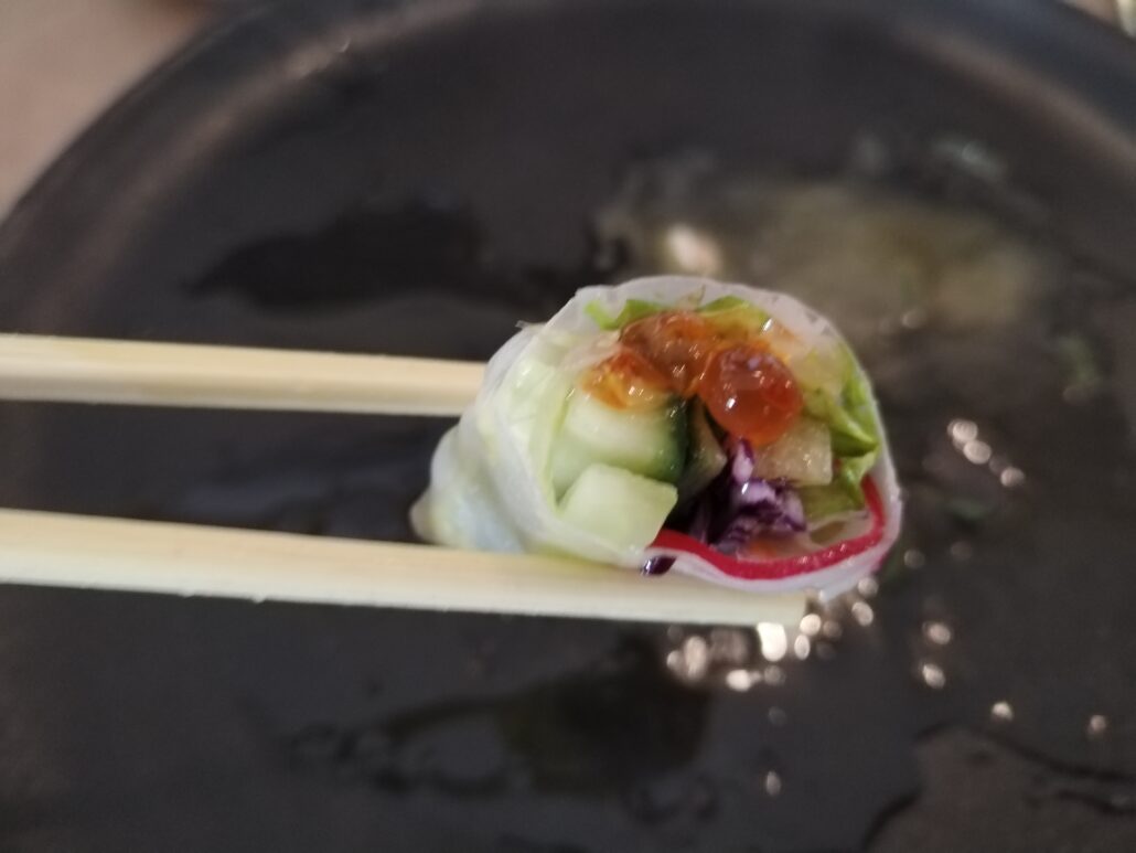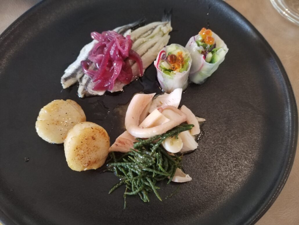 Si inizia con un antipasto a base di capesante scottate alla piastra con burro salato e salsa di soia, proseguendo con uno spring roll vietnamita con verdure crude e uova di salmone selvaggio “Sockeye” dell’Alaska, le alici marinate in aceto di riso, provenienti dall’Arcipelago Toscano, e terminare con il polpo scottato con salicornia al vapore e wasabi, originario dell’Argentario.
