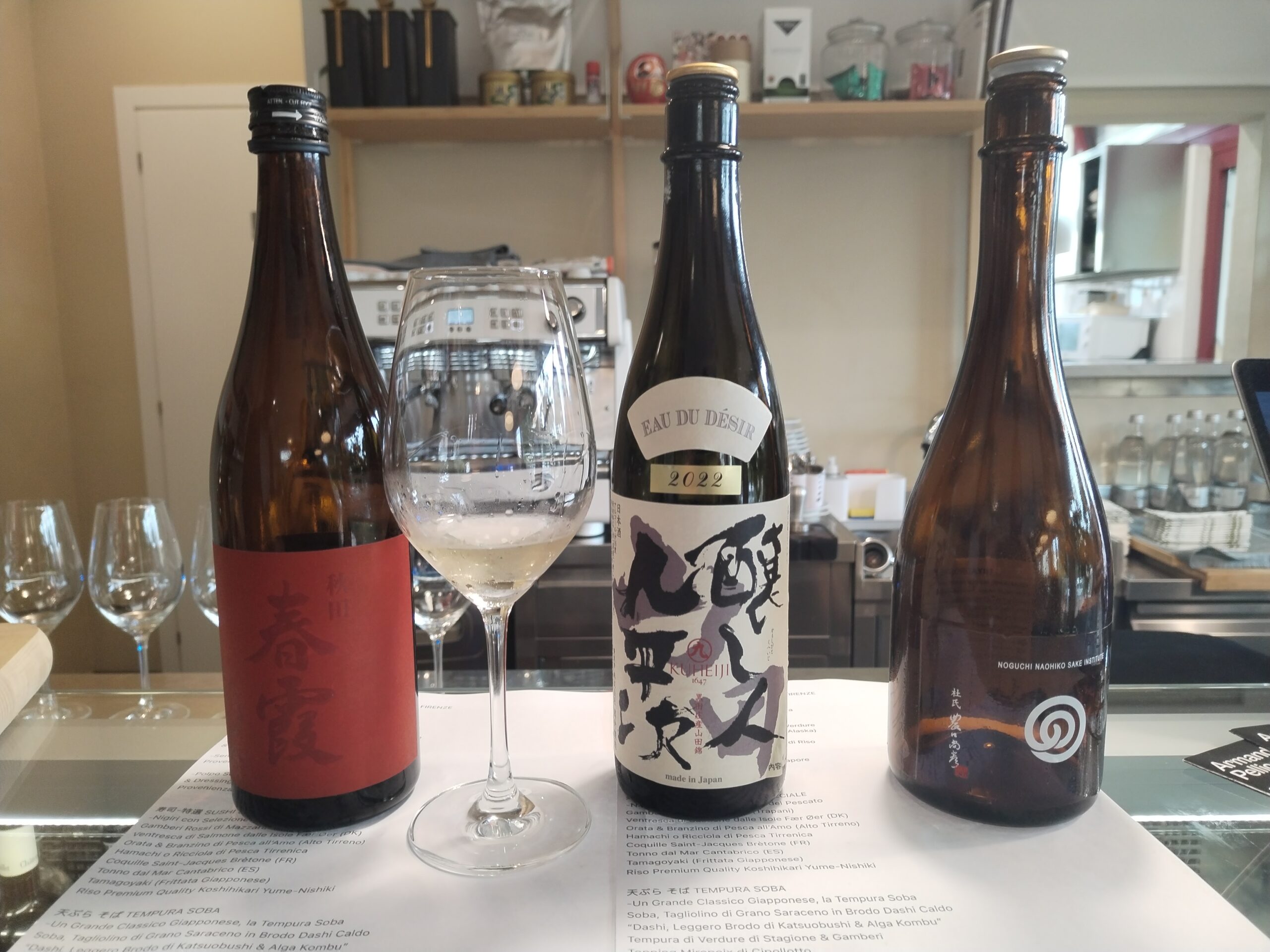 Ci potremmo soffermare a lungo sulla profusione di varietà ittiche impiegate e sui criteri di tracciabilità, seriamente perseguiti qui ad Oka, ma basta semplicemente pronunciare Koshihikari Yume-Nishiki e comprendere che, in un mondo dove l’attenzione selettiva di chef e clientela è tutta incentrata su quello che c’è sopra al sushi, Saeko Okada accarezza il palato dei suoi ospiti con un riso premiato dalla piacevole texture e con un gusto cerealicolo deciso ma non invasivo, perfetto per comprendere le diverse consistenze e il sapore del pescato… il tutto lautamente innaffiato con un Kamoshibito Kuheiji “Eau de Desir”, un sake in stile Junmai Daiginjo prodotto dalla cantina Banjo Jozo, ubicata a Nagoya nella Prefettura di Aichi, prodotto con riso Yamadanishiki con Seimai Buai al 50%.