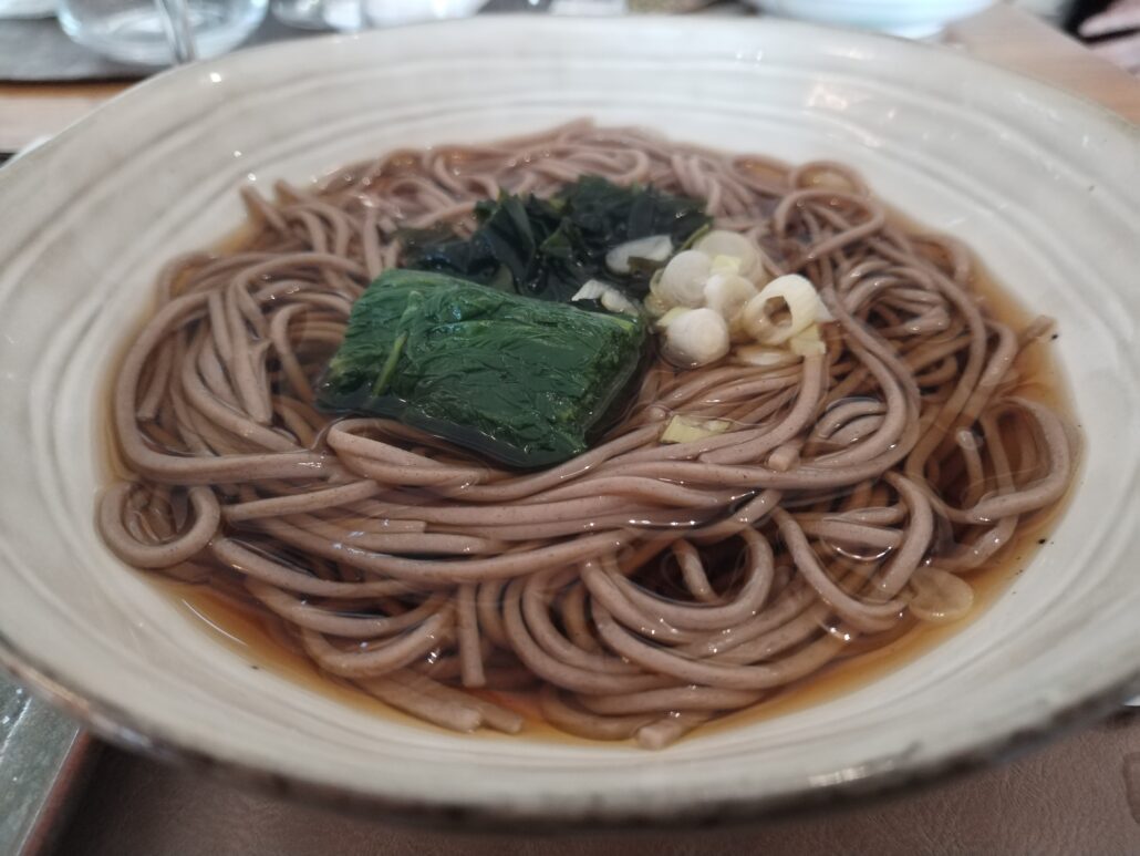 Per gli irriducibili della pasta, se così la vogliamo definire, arrivano i tagliolini di grano saraceno in brodo, ma è meglio chiamare le cose con il loro nome: soba in brodo dashi, fatto con katsuobushi e alga kombu, accompagnato con tempura di verdure di stagione e gamberi con mirepoix di cipollotto fresco a guarnire.