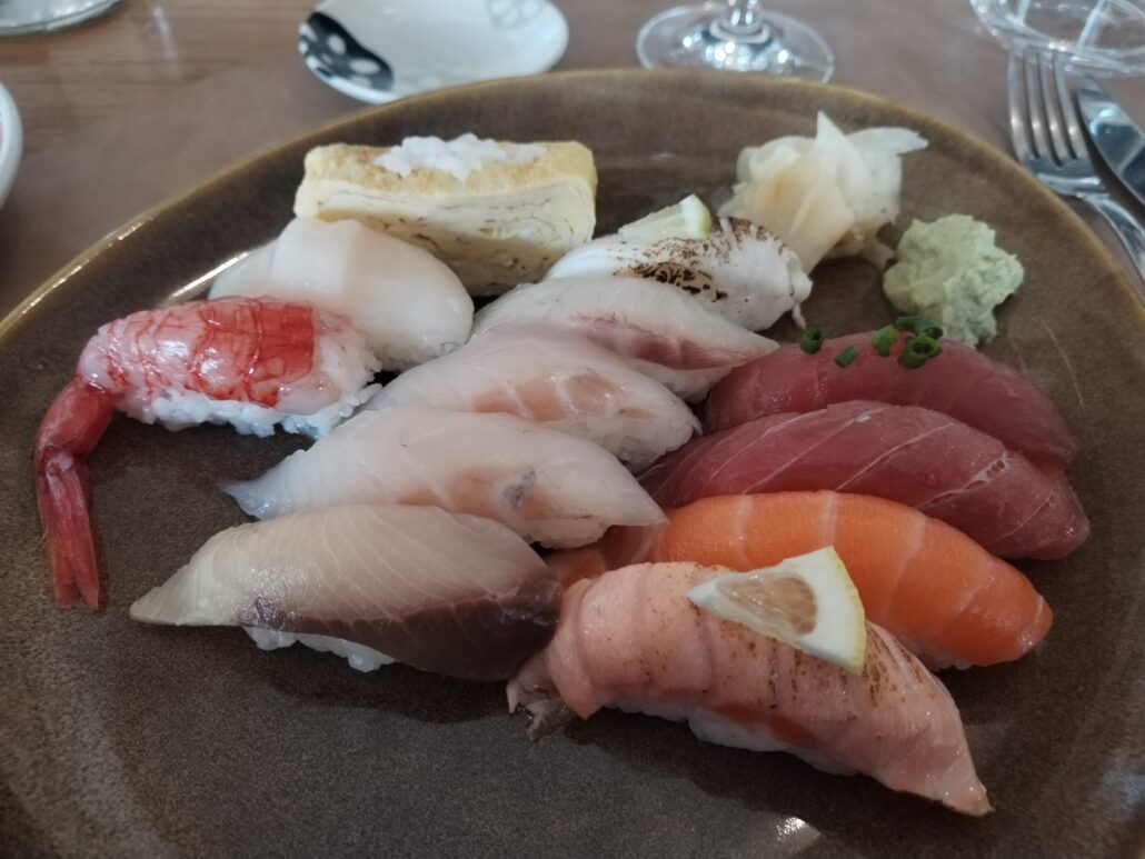 Dopo un antipasto ad alzare vertiginosamente l’asticella, arriva la selezione speciale di sushi: al gambero rosso di Mazzara del Vallo, con la ventresca di salmone delle isole Fær Øer, con l’orata, la ricciola, detta hamachi in giapponese, e il branzino pescati all’amo nell’Alto Tirreno, la capasanta bretone, il tonno del Mar Cantabrico e quello al Tamagoyaki, la frittata giapponese.