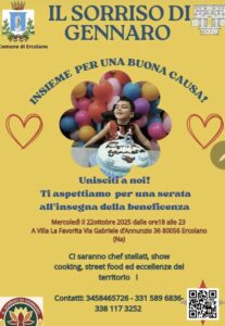 Una città intera pronta a stringersi attorno al sorriso di un bambino speciale. Mercoledì 22 ottobre, dalle 18 alle 23, la splendida Villa La Favorita di Ercolano farà da cornice all’evento benefico “Il Sorriso di Gennaro”, una serata dedicata alla solidarietà e al gusto, organizzata con il patrocinio del Comune di Ercolano e della Fondazione Ente Ville Vesuviane.