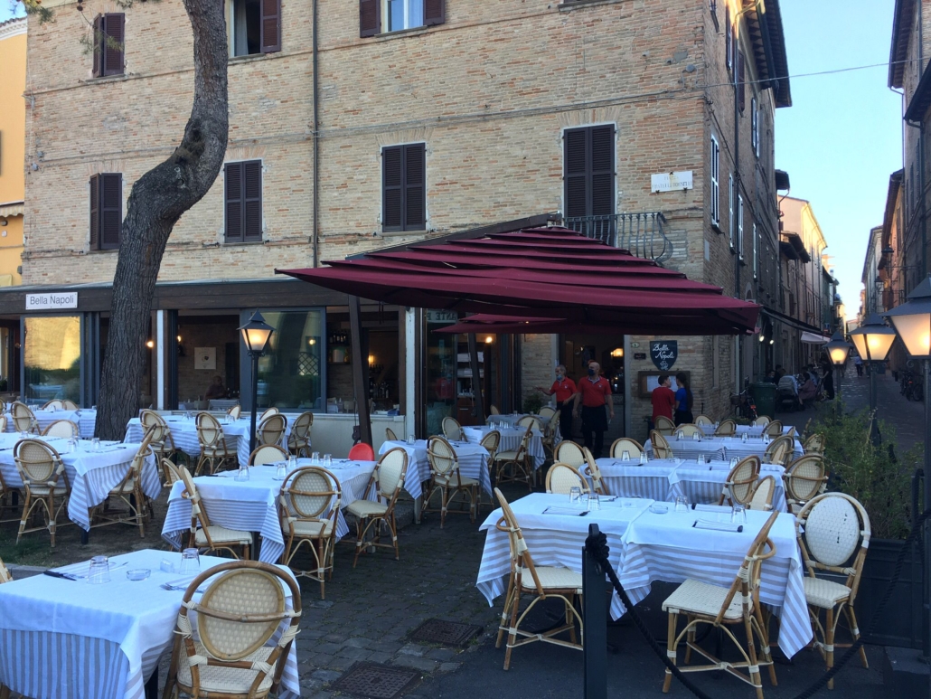 “Bella Napoli” è il ristorante pizzeria di Vincenzo Ceglia situato “in un angolo di Piazza Rosselli, proprio all’ingresso del centro storico di Fano”. Quarant’anni fa, Vincenzo e il suo socio di allora, Giuseppe Piscopo, decisero di aprire un’attività dandogli il nome di “una pizzeria dei ricordi”, a loro molto cara. Non è un caso che all’interno del locale ci siano dei chiari rimandi alla città partenopea, primo fra tutti un murale paesaggistico. Gli ospiti possono accomodarsi sia in un ambiente chiuso, suddiviso in tre sale con una capienza di 64 posti, in due di esse, e 35 in un’altra, sia in uno spazio esterno con 200 coperti. La mise en place è quella classica: la scelta di tovaglie e tovaglioli è fondamentale. Ai tavoli della “Bella Napoli” si siedono giovani dai 24 anni in su ma anche persone adulte, fino ai 70 anni. Uno staff esperto accoglie sempre con un sorriso un pubblico di fedelissimi.