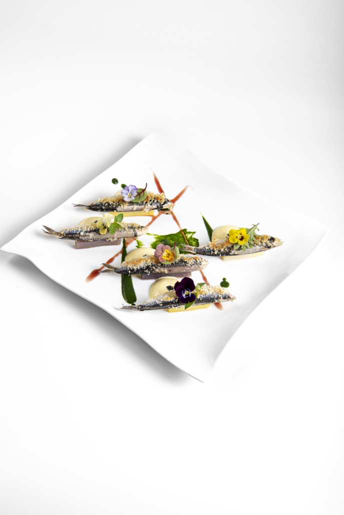La proposta culinaria dello chef Luigi Tramontano “si evolve” nella sua personale idea delle alici arreganate ripiene di merluzzo, condito con alghe e limone. Il pesce azzurro riserva all’ospite un boccone delicato ma gustoso; la farcia tenera e fresca stuzzica inevitabilmente le papille gustative. Uno zabaione allo zafferano in pistilli è la nota spumosa e speziata di questo piatto; in superficie una colatura di alici sferificata impreziosisce a mo’ di caviale. Briciole di pane tostato insaporito con olio aromatizzato alla maggiorana decorano le alici, aderendo sul dorso lucido e brillante quasi come fossero granelli di sabbia. La masticazione è vivace; la bontà è a tratti incisiva. Sprazzi di aceto profumato ai lamponi intersecano chiazze di salsa verde alla menta e prezzemolo. L’impiattamento di mare è corposo.