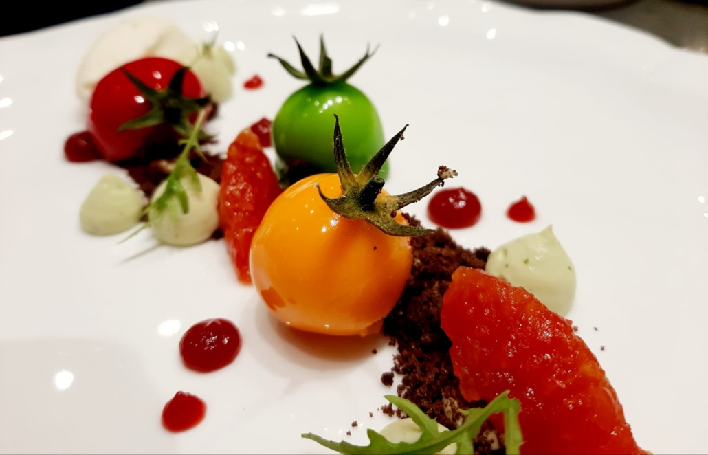 A Positano, in una frangia della costiera amalfitana, dove tutto ciò che è immobile è quasi perpendicolare ad un tratto di mare che avanza nel golfo di Salerno, c’è un luogo dove Le Agavi toccano una stella del cielo panoramico. Lo skyline trasmette un fascino incondizionato; l’emozione culinaria è memorabile. Il ristorante La Serra è avvolto da un’atmosfera personalizzata. Il fine dining dello chef Luigi Tramontano è decisamente esclusivo, riconoscibile nella sua veste stellata. La tradizione culinaria partenopea è onnipresente; il patrimonio gastronomico campano lascia un segno ricco e variegato. Il menù presenta una sezione dedicata “ai piatti delle radici”. L’insalata di pomodori napoletana in versione dolce è il frutto di una cucina mediterranea interpretata in modo autentico e innovativo. Una mousse di burrata a base di latte di bufala diventa la farcitura, fresca e cremosa, di una cheesecake in formato monoporzione. La glassa al lampone, lucida e trasparente, imita la buccia rossa del pomodoro ciliegino, riproposto in questo dessert anche nella variante giallo melone e verde mela. La nota amara del crumble al cacao esalta il tenore acidulo del frutto di bosco. Una ganache di rucola al cioccolato bianco mostra una texture soffice e piacevolmente amaricata. Il gelato all’olio evo da monocultivar ravece sottolinea la persistenza di un gusto assolutamente fragrante, aromatico e brioso al palato; intanto il sentore agrumato di una quenelle di pomodoro si sposa bene con il sapore rotondo e vellutato della vaniglia. L’equilibrio di questa portata è perfetto.