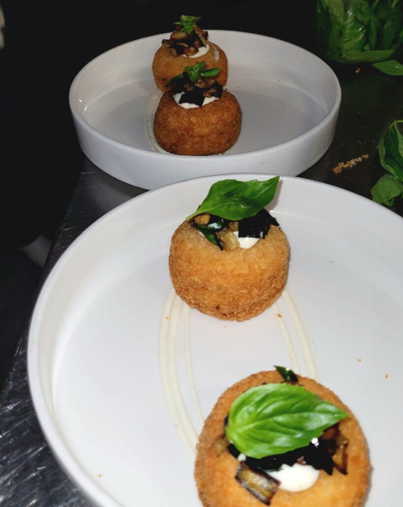 Tra gli antipasti del ristorante partenopeo la classica ‘mozzarella in carrozza’ con melanzane a funghetto, burro alle acciughe e zest al limone su salsa provola.