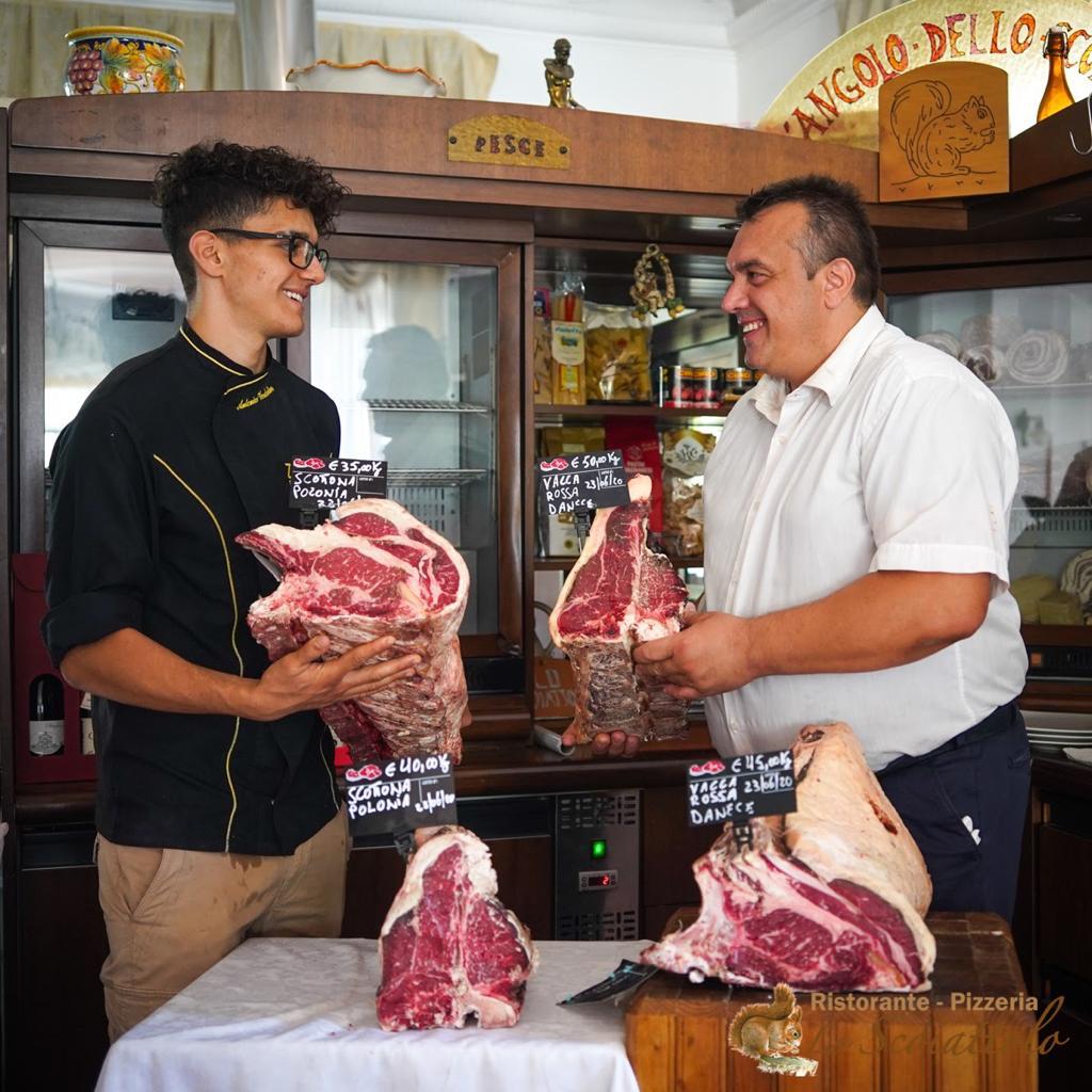 Sono proprio padre e figlio ad occuparsi della accurata ricerca delle materie prime e dei prodotti tipici locali da offrire ai propri ospiti. Alla “regola” del Km0, infatti, sfuggono solo le carni bovine; provenienti dall’appennino ma anche da filiera inglese e francese. Gran parte dei tagli, in particolar modo questi ultimi, vengono frollati in appositi frigoriferi di stoccaggio per un periodo di 30-45 giorni in modo da essere servite al massimo della loro succosità. Tripudio papillare. Sarà proprio la carne, ben presto, protagonista nel menù de “Lo Scoiattolo” e con qualche ritocco sorprendente ne vedremo delle belle. Il tutto senza compromettere la loro identità casareccia, senza mai allentare il legame aderente con il territorio…innovare senza stravolgere sembrerebbe essere la filosofia dei Verdoliva.