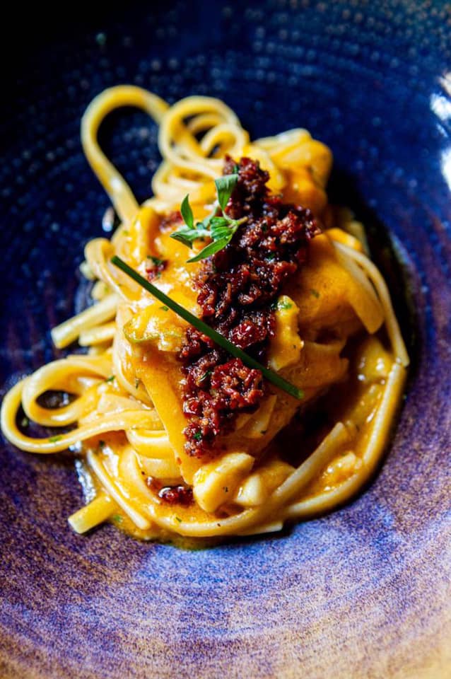 La linguina viene mantecata con uno scorfano in cubetti marinato al limone; il condimento è a base di bottarga di tonno grattugiata, pomodoro secco tritato e olive nere denocciolate. I fiori di zucca a julienne decorano con peculiarità. In questo primo piatto i sapori originali degli ingredienti sono in equilibrio. La sapidità si ricava da una triade perfetta di esaltatori, i protagonisti di una salsa corposa ed evidentemente saporita che si amalgama bene ad ogni singola forchettata. Il gambero rosso del Mar Mediterraneo trionfa nella versione nostrana, quella che valorizza appieno una cucina territoriale ricca di gusto; ma anche nella “variante itinerante”, la stessa che si proietta in una dimensione culinaria alternativa. La carne soda e succosa del crostaceo si veste di una panatura esclusiva, a base di mozzarella di bufala campana: è un tripudio di dolcezza e di consistenze inconfondibili. Una spadellata vivace di pomodorini, capperi e olive accompagna questo connubio di qualità e con chiari sentori rustici. Una crema di basilico, dal profumo fresco e piacevolmente aromatico, prepara le papille gustative ad un boccone con un sapore intenso. La scelta è tra un antipasto o un secondo piatto non ordinario. Un’insalatina di stagione condita con un dressing di soia dolce viene interrotta dalla fragranza oleosa delle mandorle; mentre una maionese al wasabi esalta con vigore il gusto variopinto di un cous cous di verdurine. Anche in questa proposta, la presenza del gambero è inevitabile. La filosofia culinaria dello chef Giuseppe Aversa contempla esplicitamente “varie tematiche del gusto”, lasciandone sempre in primo piano le diverse sensorialità. Da questo punto in poi, inizia quel movimento virtuoso che parte dall’impiattamento e finisce con il primo assaggio. L’estetica di un piatto stimola un segnale fisiologico che mette in relazione tutte le sfere sensoriali, in modo diretto e proporzionato. “La forma è una sorta di piacere che trova conferma nel gusto ed è sostenuto dal palato” – sottolinea Giuseppe Aversa, lo chef del ristorante Il Buco.