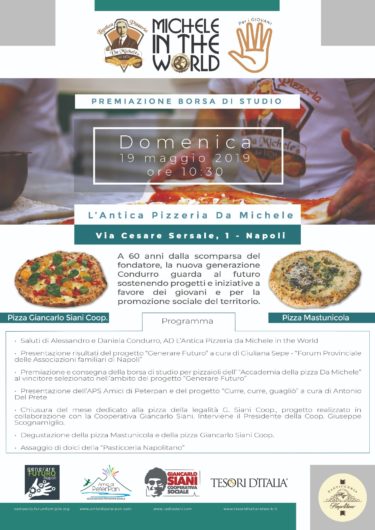 Solidarietà ed attenzione al sociale caratterizzano, dunque, tuttora le scelte delle nuove generazioni dei Condurro, che con entusiasmo accolgono e promuovono proposte del terzo settore e del volontariato. Gli A.D. di Michele in the world, con il loro staff, scelgono percorsi che sono tesi a solidi orizzonti etici, per dare un contributo fattivo alla rinascita del nostro territorio, a favore dei giovani. Domenica 19 maggio, presso la sede dell’Antica Pizzeria “Da Michele”, la Mitw assegnerà una borsa di studio per pizzaiolo a uno dei giovani partecipanti al progetto Generare Futuro condotto a Napoli dal Forum Provinciale delle Associazioni Familiari in stretta collaborazione con le Acli e l’Arcidiocesi.