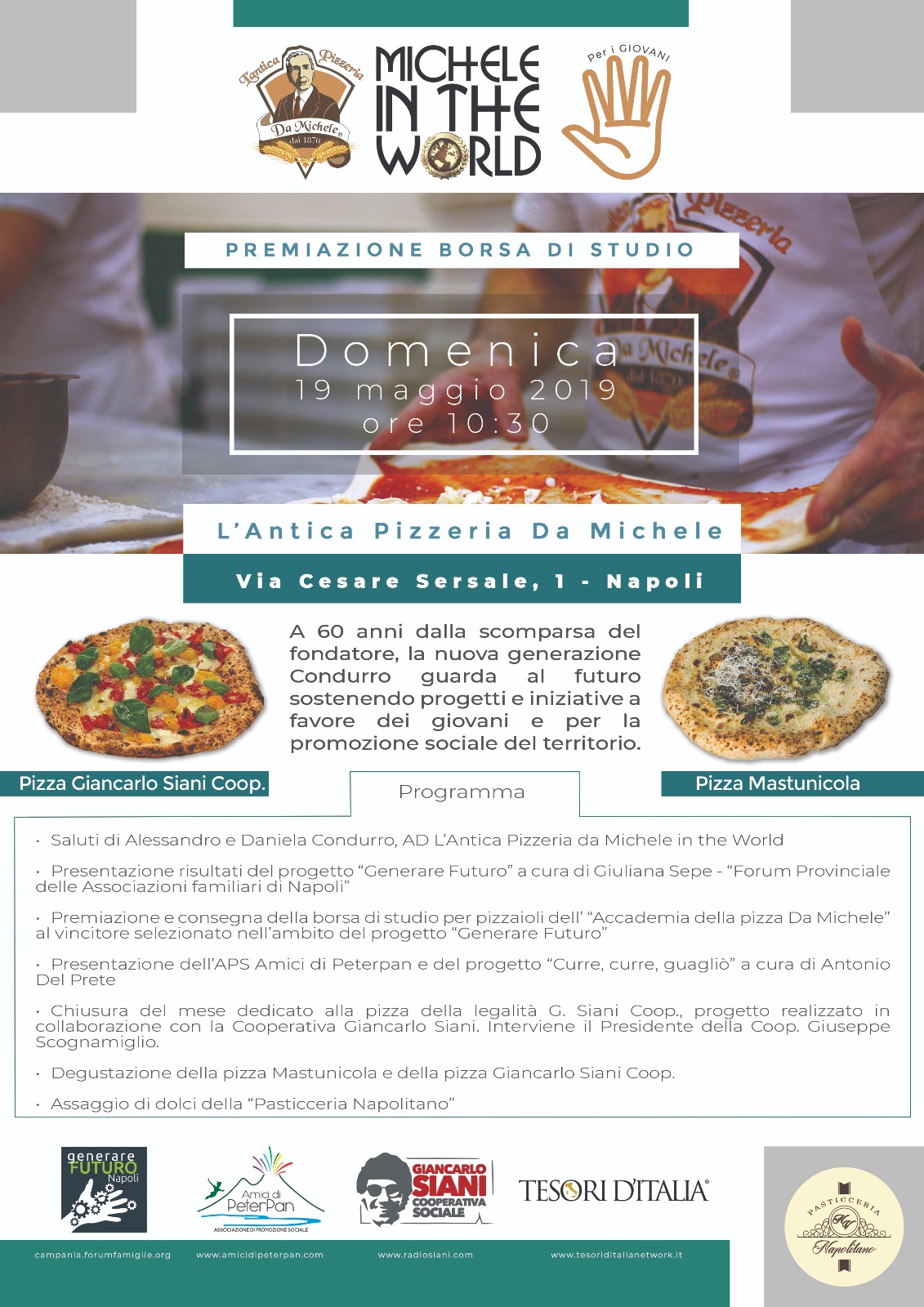 A 60 anni dalla scomparsa del fondatore, la nuova generazione Condurro guarda al futuro sostenendo progetti ed iniziative a favore dei giovani e per la promozione sociale del territorio. La Michele in the word srl (Mitw) ha fatto sue la particolare attenzione e la passione intelligente e solidale alla base dell’operare quotidiano dell’Antica Pizzeria da Michele di via Cesare Sersale, che ormai dal 1870 offre ai suoi clienti pizza di grande qualità, ad un prezzo popolare, specchio della visione democratica dei fondatori.