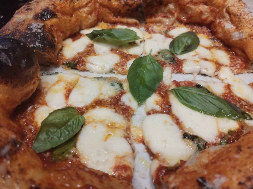 E poi arriva il turno delle pizze fumanti e golose: il passaggio da Est a Ovest avviene con la Kraken, perché l’idea del polpo alla brace con la crema di patate, il fiordilatte, il peperone sciuscillone di Teggiano e la burrata liquida con scorza fresca di arancia, grattugiata direttamente dal mastro pizzaiolo, intrigava molto.