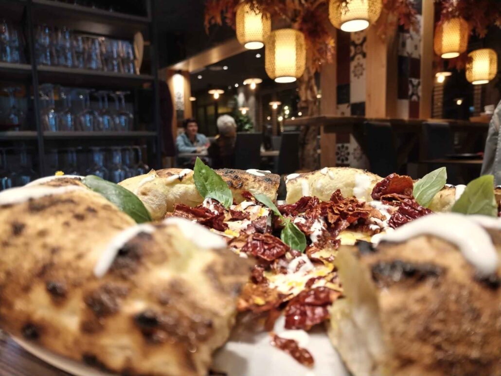 Una volta entrati, si è accolti con cortesia e senso dell’ospitalità e, preso posto, l’immersione nell’ambientazione fatta di lanterne, motivi vegetali e richiami orientali, con un forno a fare da sfondo, ci ricorda che qui la pizza e il sushi sono di casa.