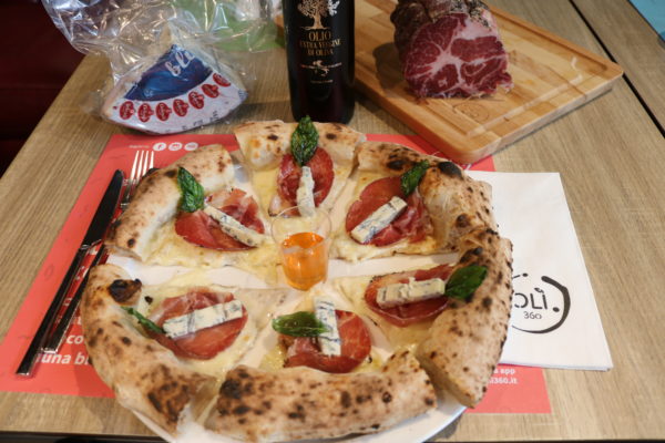 Anche la pizzeria è pensata per essere in autentico stile Olì 360°: la passione per le materie prime del territorio incontrano la creatività del pizzaiolo Vincenzo Ceruso che, lo scorso 27 marzo, giorno del primo anniversario di attività per Olì360, ha presentato una pizza con Fior di latte di Agerola, capocollo di maialino nero casertano, Blu di bufala e basilico essiccato. Per la presenza del formaggio erborinato, il pizzaiolo ha consigliato di abbinare gli spicchi a del miele artigianale di Benevento.