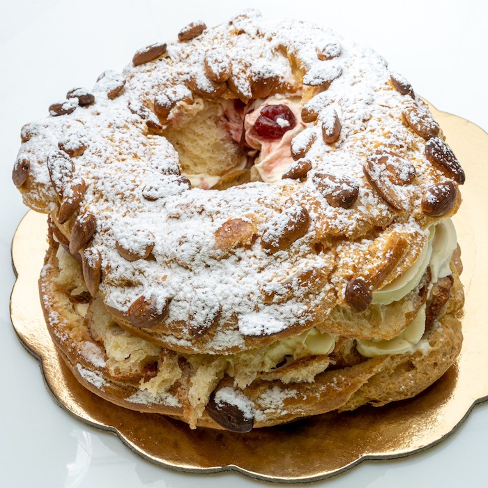 Un lievitato nel lievitato dunque. Una ganache aromatizzata alla zuppa inglese, amarene candite e un babà inzuppato al rhum sono la farcitura di questo prodotto innovativo che viene glassato con fine cioccolato bianco e guarnito con mandorle caramellizzate.