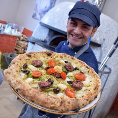 Si chiama la Pizza Pezzente – racconta il pizzaiolo – prende il nome dalla salsiccia di Somma Vesuviana che utilizzo nel condimento. Questa specialità di pizza ha una base bianca con provola affumicata, scarola riccia bianca, fettine del salame pezzente e pomodorino del Piennolo del Vesuvio”.