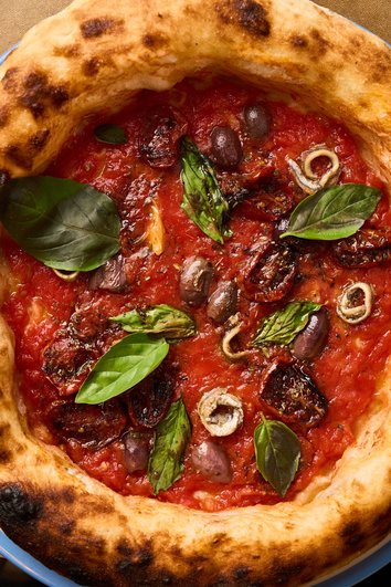 In particolare la pizza è preparata con un topping a base di formaggio blu di pecora, caciocavallo antico di Gragnano, mozzarella di bufala aversana DOP, cacioricotta cilentano presidio Slow Food e qualche fiocco di crema cacio e pepe. A completare questa pizza è la firma dello chef, in particolare la confettura di antico pomodoro cannellino dei Campi Flegrei e un filo d’olio extravergine d’oliva cilentano DOP.
