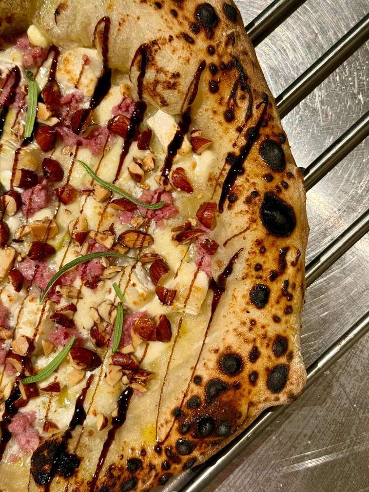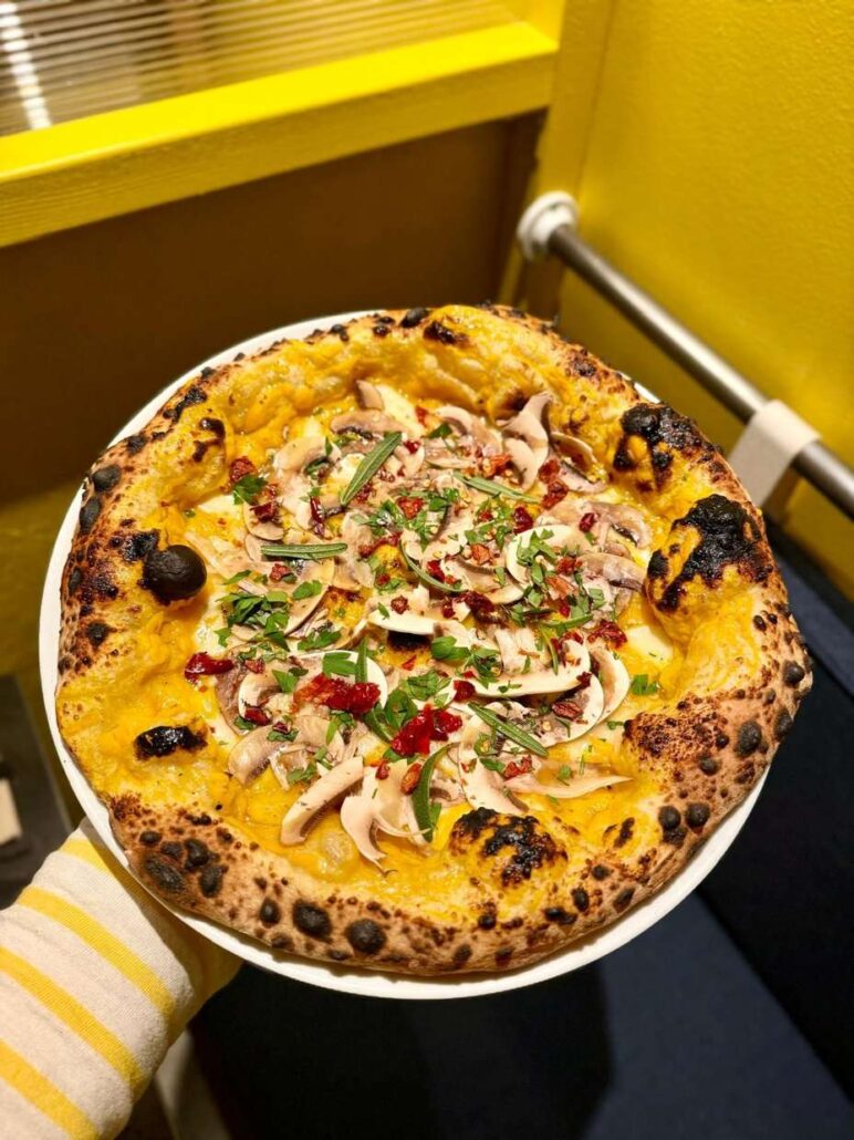 Un’altra pizza molto apprezzata è la loro “Autunno”, preparata con crema di zucca, fiordilatte, gorgonzola, olio aromatizzato all’aglio e, in uscita, funghi champignon, peperone crusco e prezzemolo. Aspetto che distingue Mer Deg dalla concorrenza anche la loro proposta vegan, con crema di zucca, funghi champignon e, in uscita, spinaci e mandorle tostate.