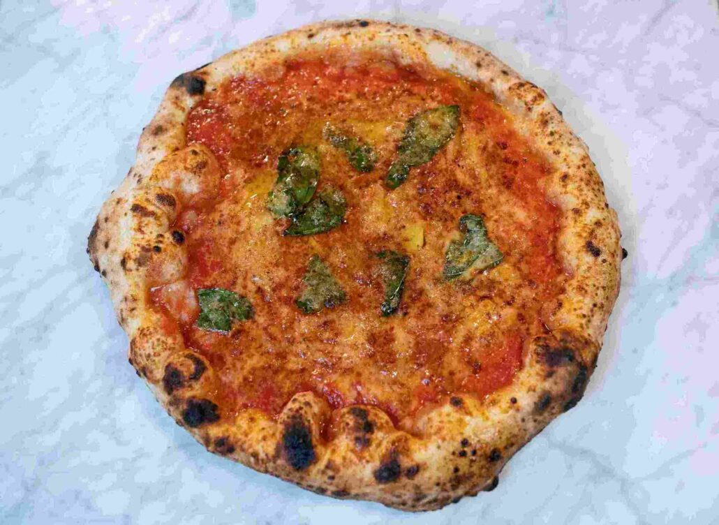 L’impasto delle pizze è quello classico napoletano, composto da acqua, farina, sale e lievito naturale, prodotto da loro stessi. La farina utilizzata è quella di grano tenero di tipo 0, con l’aggiunta di una piccola percentuale di farina 1 macinata a pietra. La stessa che utilizzano per nutrire il loro lievito naturale. La scelta di utilizzare il lievito madre è data dal fatto che questo apporta all’impasto tantissimi benefici, dalla digeribilità, all’aromaticità e al gusto.