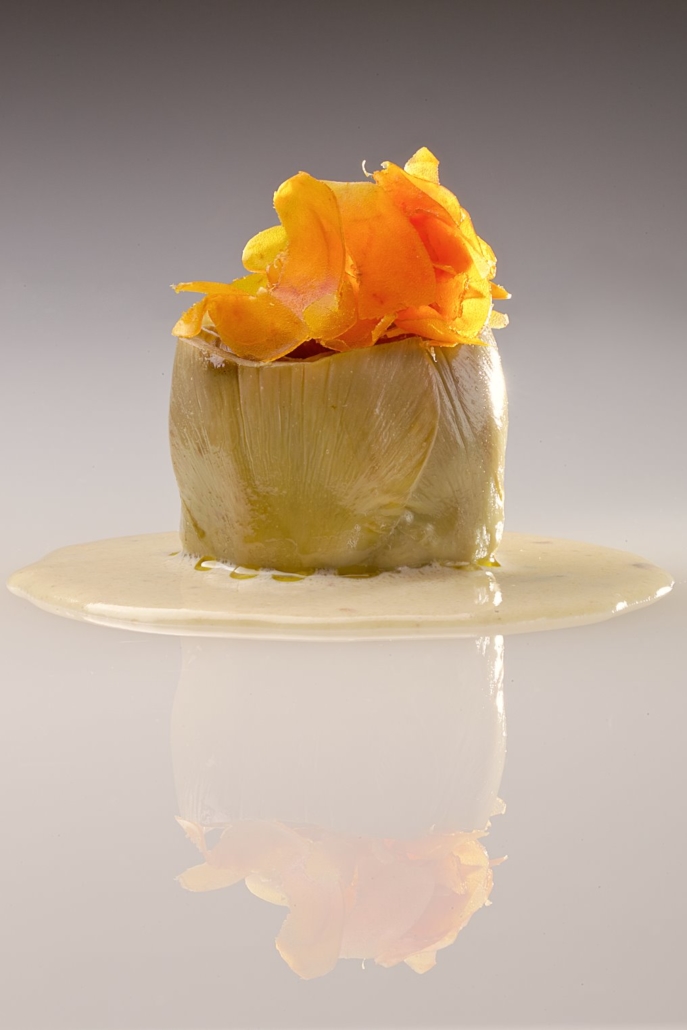 Il carciofo di Schito, frazione di Castellammare di Stabia, da sempre nota per la produzione di questa varietà, speciale soprattutto nei ricordi dello chef Paolo Gramaglia, che da piccolo si lasciava inebriare dal profumo del carciofo arrostito, mentre si faceva piacevolmente avvolgere da quel fumo rilasciato durante la cottura, la “nebbia partenopea”, quella che durante le domeniche di festa pervadeva i vicoli, le piazze, interi quartieri della Napoli verace. Il carciofo viene cotto a bassa temperatura con l’aggiunta di un cubetto di salame di bufalo cilentano dal gusto intenso e speziato, una foglia di prezzemolo fresco, cristalli di sale e una spolverata di pepe. A cottura ultimata il carciofo viene servito su una salsa di alici di Cetara, dal sapore rustico e vivace, e sull’estremità vengono aggiunte 5 fette di bottarga di muggine sarda tagliate finemente, per un tocco finale assolutamente pregiato.