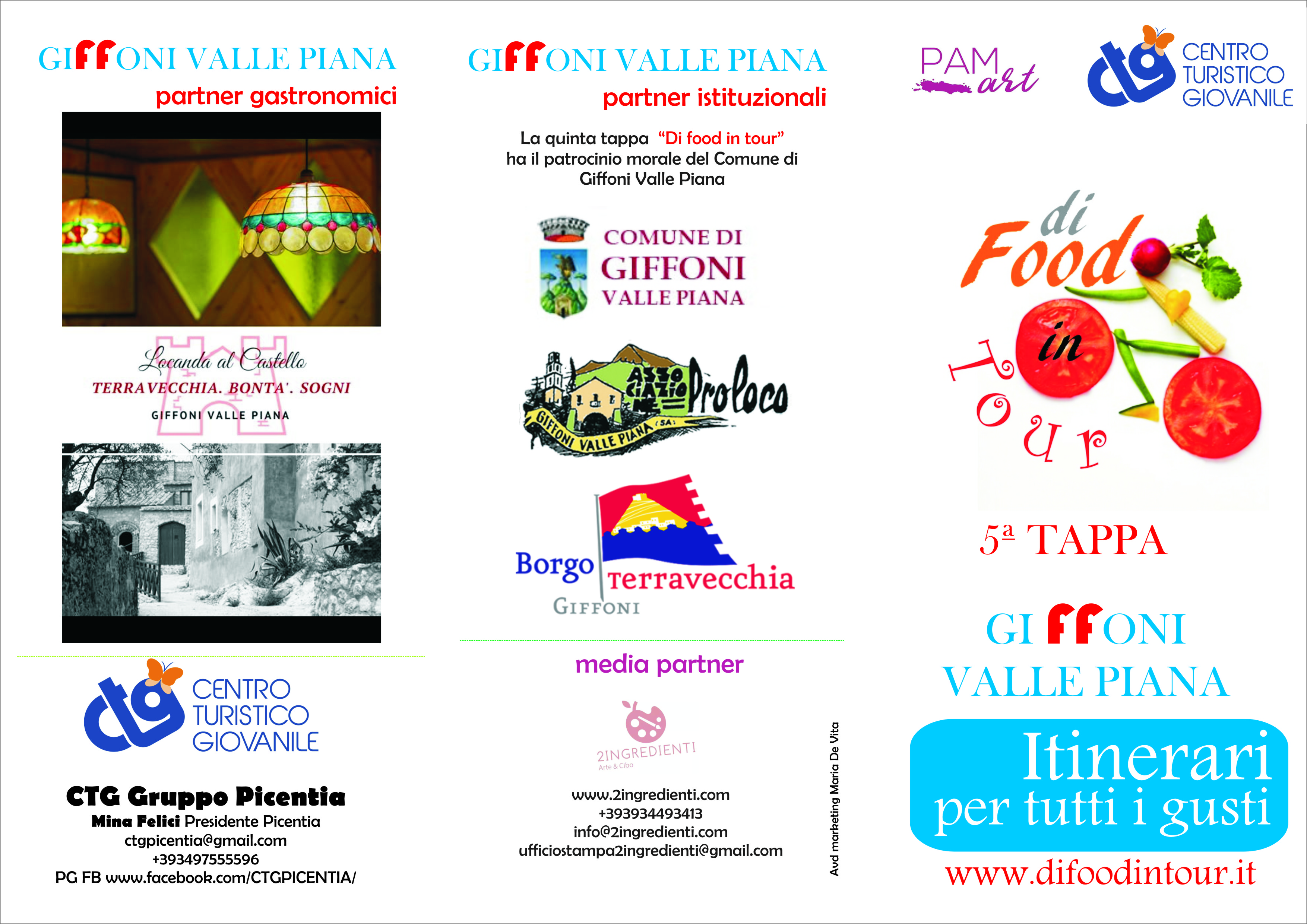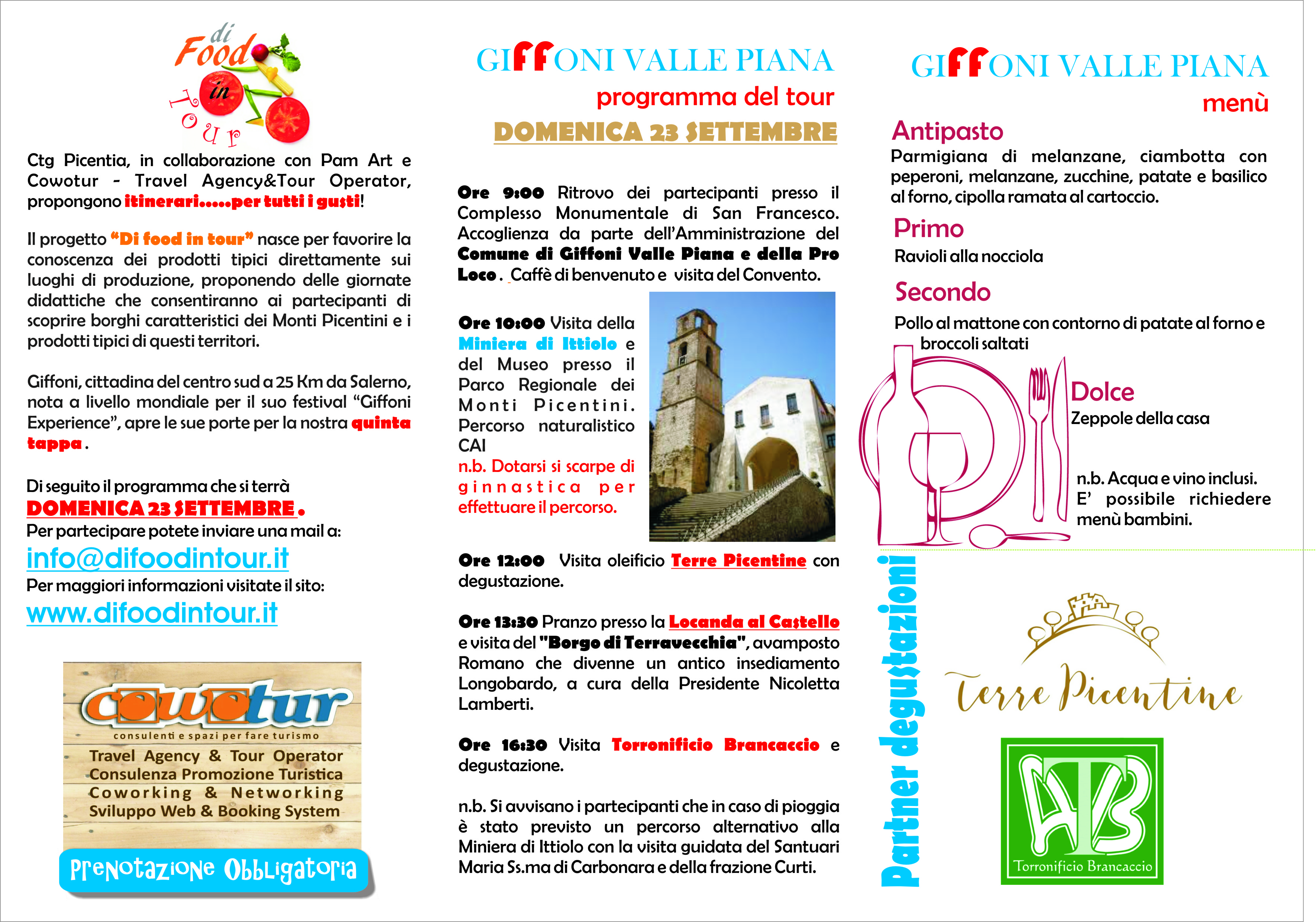 Il progetto “Di Food in Tour” tutto al femminile promosso dal CTG Gruppo Picentia e rappresentato dalla Dott.ssa Mina Felici e dalla Dott.ssa Adele Cavallo Consigliere nazionale CTG, dallo Studio PAMart di Consulenza e Progettazione culturale della Dott.ssa Annamaria Parlato, storica dell’arte e giornalista enogastronomica, da Cowotur-Travel Agency&Tour Operator a Mercatello della Dott.ssa Rosa Genovese, Presidente della Pro Loco di Castiglione del Genovesi, e dalla Dott.ssa Maria de Vita esperta di marketing territoriale, è notevolmente cresciuto sul territorio senza contributo alcuno, avvalendosi della partecipazione di tanti salernitani incuriositi dalle bellezze di cui sono circondati a pochi chilometri da casa e di cui spesso ignorano l’esistenza.