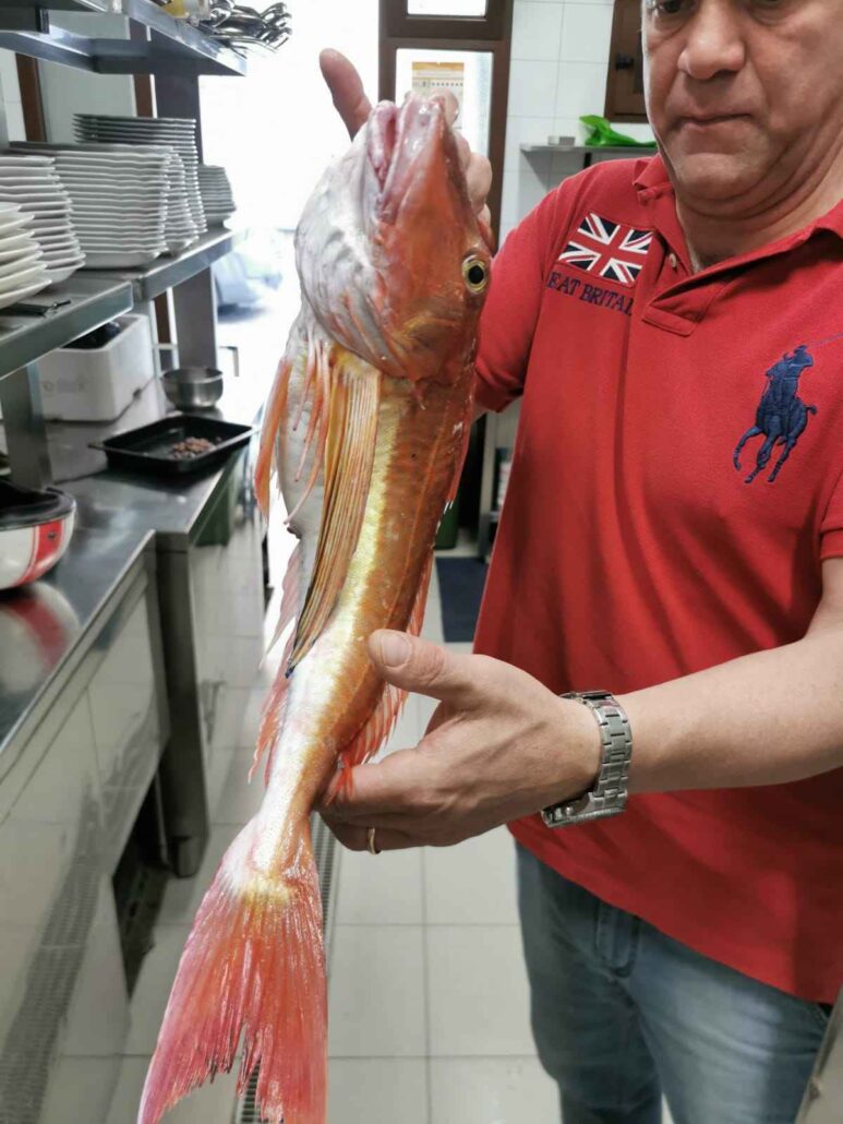 A quel punto si aggiungono il coccio e lo scorfano. Aspetto importante è che questi vengono serviti rigorosamenti interi, allo scopo di mostrare con chiarezza al cliente il prodotto consumato.