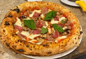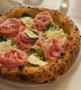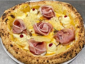 La farina utilizzata è quella di tipo 0, mentre l’impasto è un mix di prefermenti, con fermentazione totale di 48 ore e 72% di idratazione. La cottura della pizza avviene a 400 gradi, rigorosamente in forno a legna tradizionale. Lo chef, inoltre, predilige topping classici o prodotti gastronomici regionali, come le alici di Cetara, la Mozzarella di Bufala DOP, l’nduja di Stilinga, la stracciatella di Andria e altri ingredienti locali.