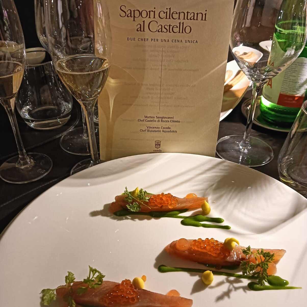 L’evento è proseguito con la cena al Bistrot dei Sanseverino: un menù di 4 portate, a base di pesce, un percorso tra i sapori cilentani, cui gli chef Sangiovanni e Cucolo hanno di volta in volta accostato le rispettive rivisitazioni innovative.