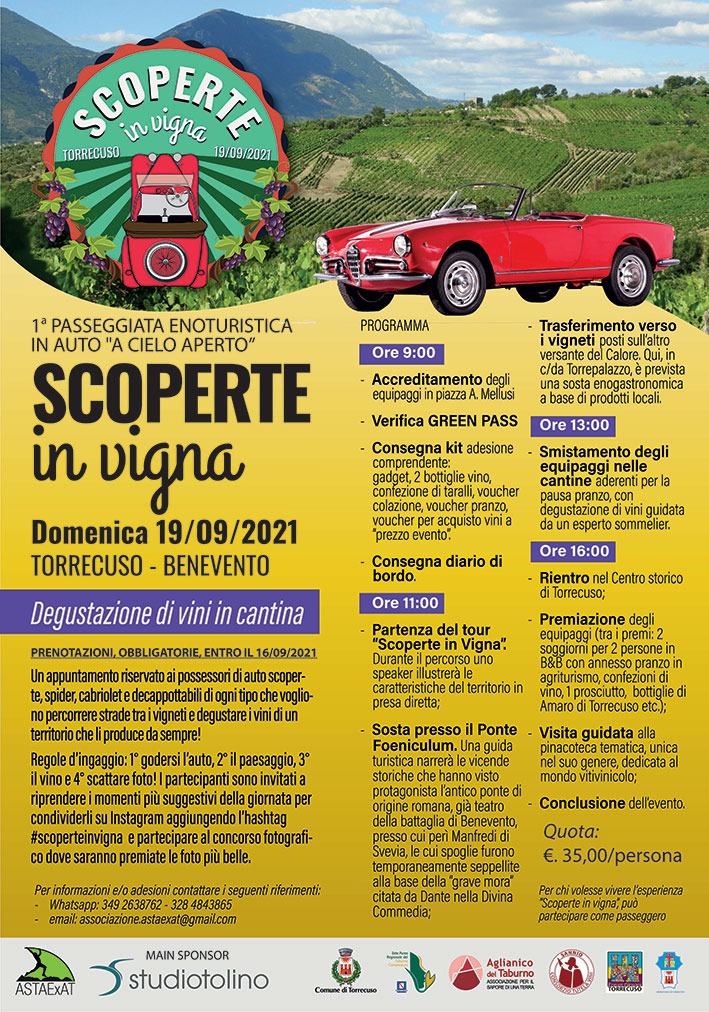 A Cautano sarà possibile visitare una mostra dedicata alle macchine di Leonardo da Vinci, fedelmente riprodotte e persino funzionanti. Successivamente al Monte Camposauro potranno apprezzarsi la flora e la fauna locale. Infine, Vitulano ospita una serie di sculture in prestigioso marmo rosso locale che saranno presentate ai partecipanti dallo scultore Mariano Goglia che ne ha realizzato la maggior parte. Il tour si concluderà a Torrecuso per visitare una pinacoteca a tema vitivinicolo, presso la sede del Comune. L’11 settembre invece si svolgerà la seconda edizione di Scoperte in Vigna.