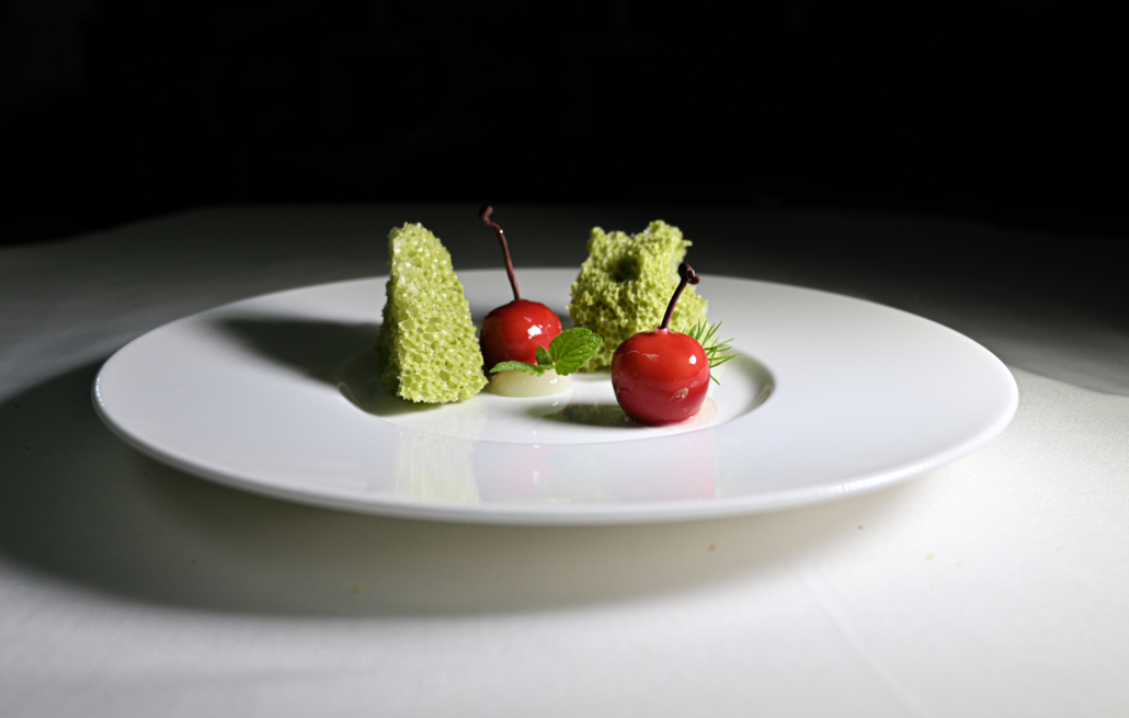 Il dessert che proprio non ti aspetti di assaggiare e che, non a caso, rilascia lunghe vibrazioni positive è una golosa drupa di colore rosso vivo. Il suo ripieno è liquoroso e aromatizzato con il vermouth “Antica Formula”; un gel di limoni in bottoni diventa il piedistallo di un bon bon dall’aspetto evidentemente interessante. Una roccia di cioccolato miscelato con la polvere fine e profumata del tè verde matcha, fa da sfondo ad una deliziosa ciliegia farcita e decorata con spezie rinfrescanti e piante aromatiche. I piatti di Francesco Sposito sono moderni perché propongono “contenuti omogenei”: l’impiattamento prevede una giustapposizione degli ingredienti simmetrica; l’estetica è ineccepibile.