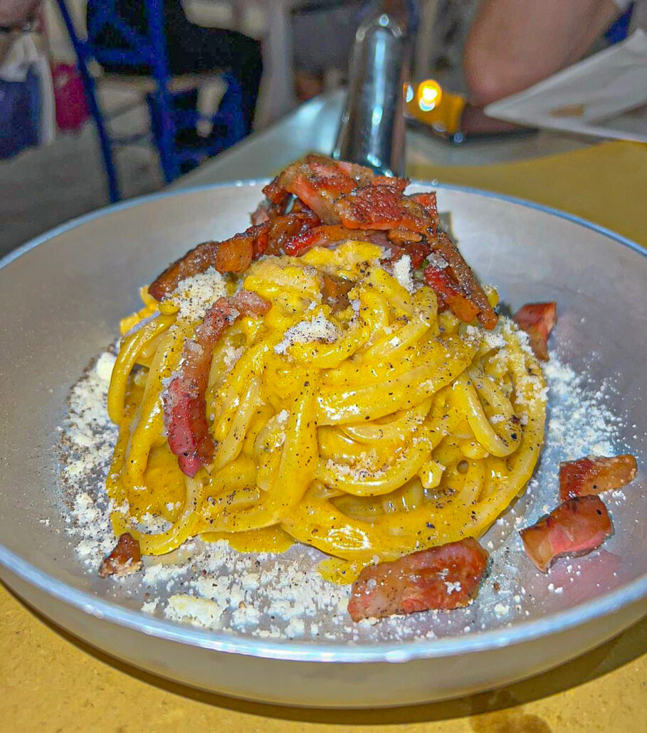 Il percorso culinario del Tiesto è una viaggio nello spazio e nel tempo, alla ricerca della più autentica espressione di bontà. Le tipicità stagionali del basso Lazio si uniscono ai più famosi piatti della tradizione romana. Saremo deliziati, infatti, dalla loro parmigiana che rispetta l’antica tradizione romana. Viaggeremo con le loro polpette cacio e pepe, con un’aggiunta di mentuccia che dona freschezza al formaggio. Saremo stupiti, infatti, dalla golosità della loro carbonara, della loro cacio e pepe con fiori di zucca e del loro spaghetto al pomodoro emulsionato. E non bisogna dimenticare il loro cavallo di battaglia per i primi: la Pistacchiosa, una calamarata con pesto di pistacchi di Bronte, guanciale croccante e cranch di pane fritto.