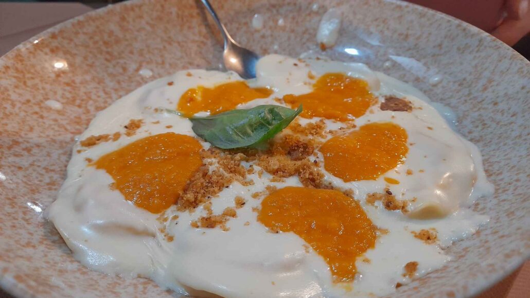 Non mancano però le rivisitazioni, come nel caso della Nerano che Michele realizza adoperando la pasta fresca, e quindi attraverso un raviolo ripieno di una crema alla Nerano appunto, e servito poi con crema di caciocavallo e zucchine fritte, e che sarà presente nel menu a partire dal prossimo mese di maggio, in sostituzione dell’attuale raviolo ripieno di cacio e zucca, più adatto ai palati invernali e a riscaldare il commensale nelle fredde serate della stagione appena conclusa.