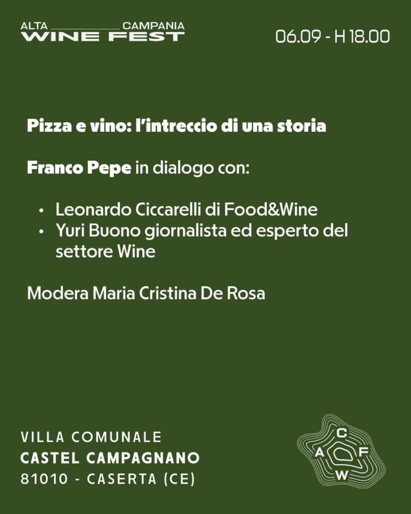 Sabato 6 settembre, sempre alle 18, ci sarà il talk con Franco Pepe, il maestro pizzaiolo della pizzeria “Pepe in grani” di Caiazzo, assieme a Leonardo Ciccarelli, giornalista ed esperto eno gastronomico oltre che redattore del magazine “Food & Wine”, e Yuri Buono, giornalista ed esperto del settore Wine. A seguire ci sarà di nuovo la masterclass “I vini degli 8 borghi, 3 areali a confronto” con Giovanni Piccirillo che introdurrà il progetto di zonazione. Al termine dei 2 giorni di masterclass ci sarà sempre una degustazione di Pallagrello Bianco e di Casavecchia.